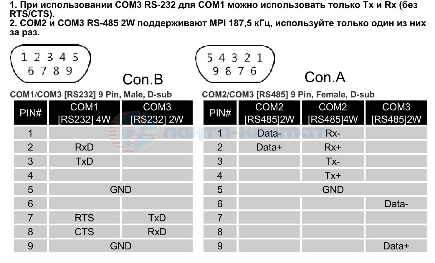 | Последовательный интерфейс | Con.A:COM2 RS-485 2W/4W,COM3 RS-485 2W Con.B: COM1 RS-232 4W, COM3 RS-232 2W* |
