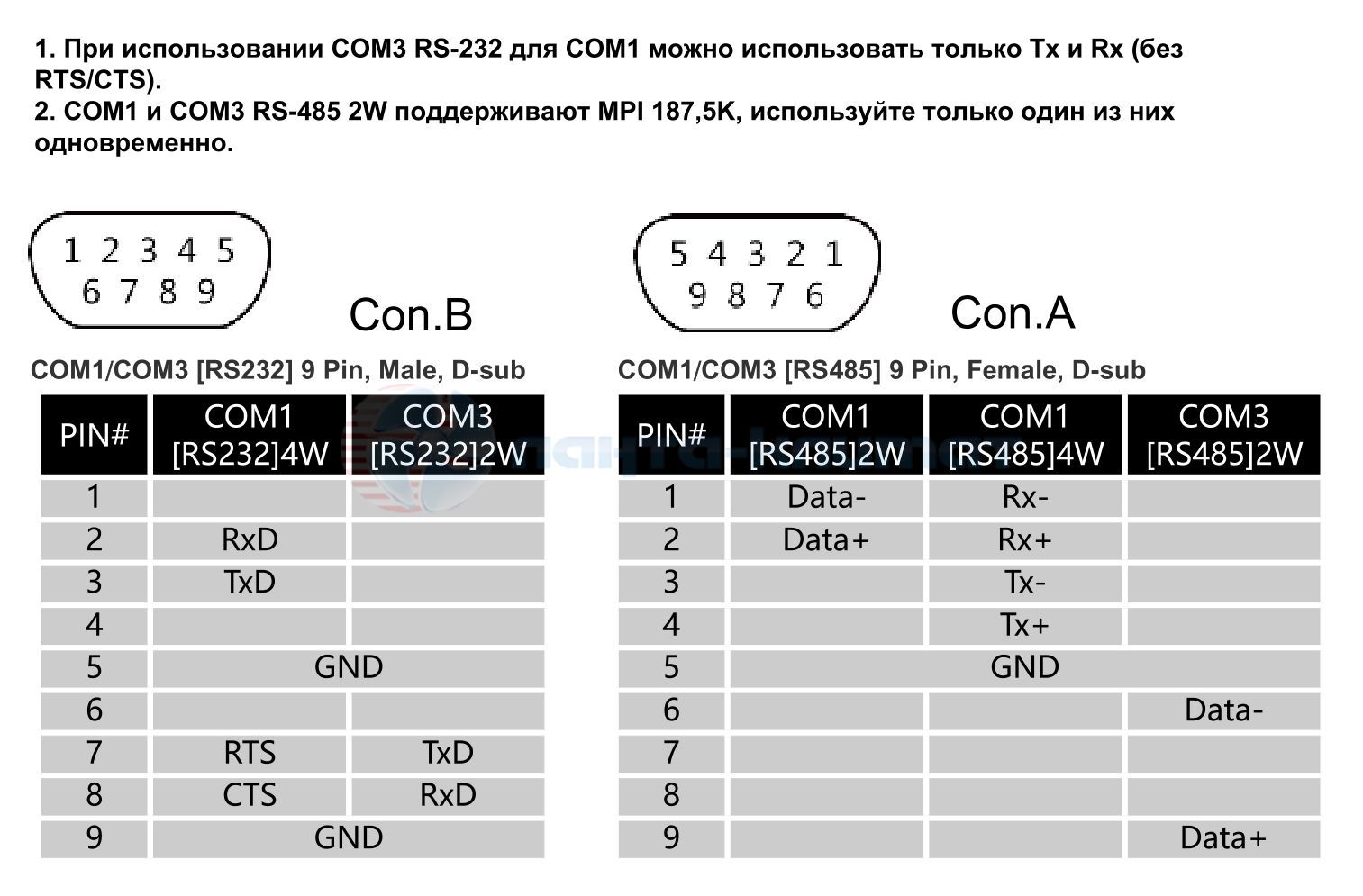 Con.B: COM1 RS-232 4W, COM3 RS-232 2W* COM1 / COM3 RS-485 2W поддерживают MPI 187,5 K, пожалуйста, используйте по одному за раз. |