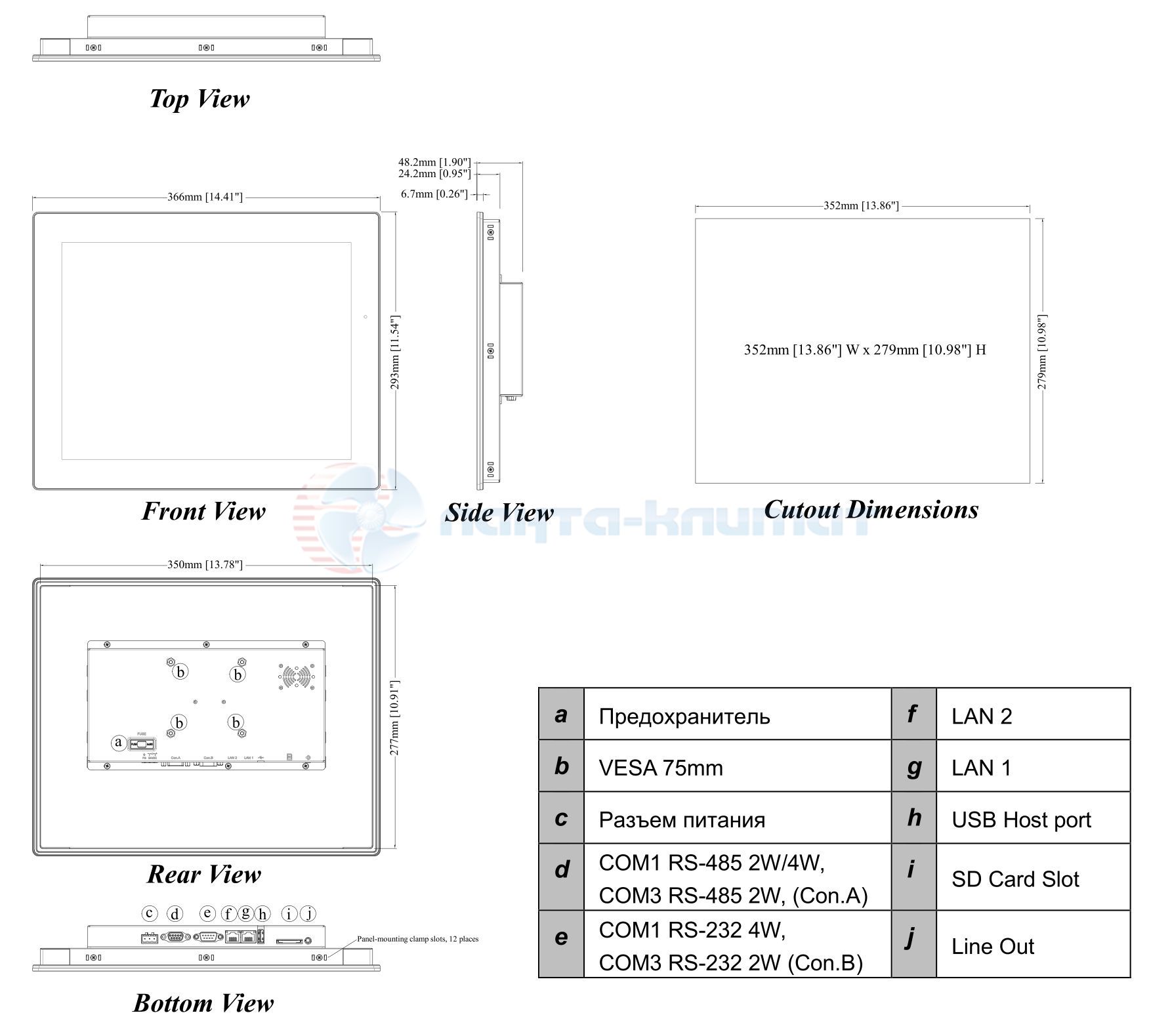 | Посадочное отверстие | 352 x 279 мм |
