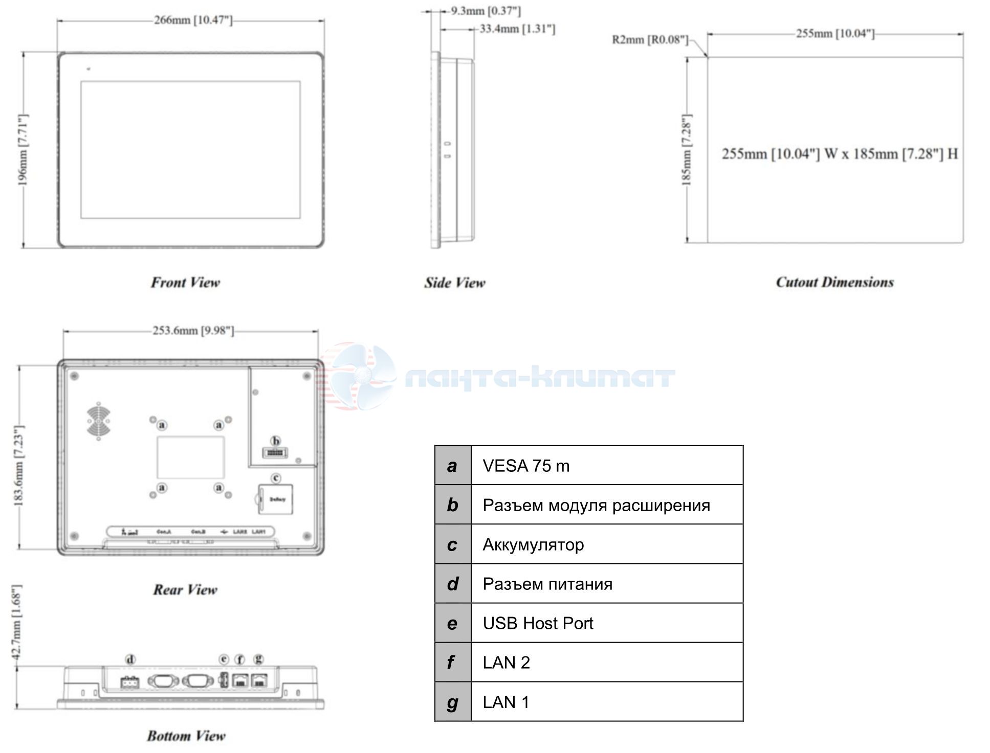 | Посадочное отверстие | 255 x 185 мм |
