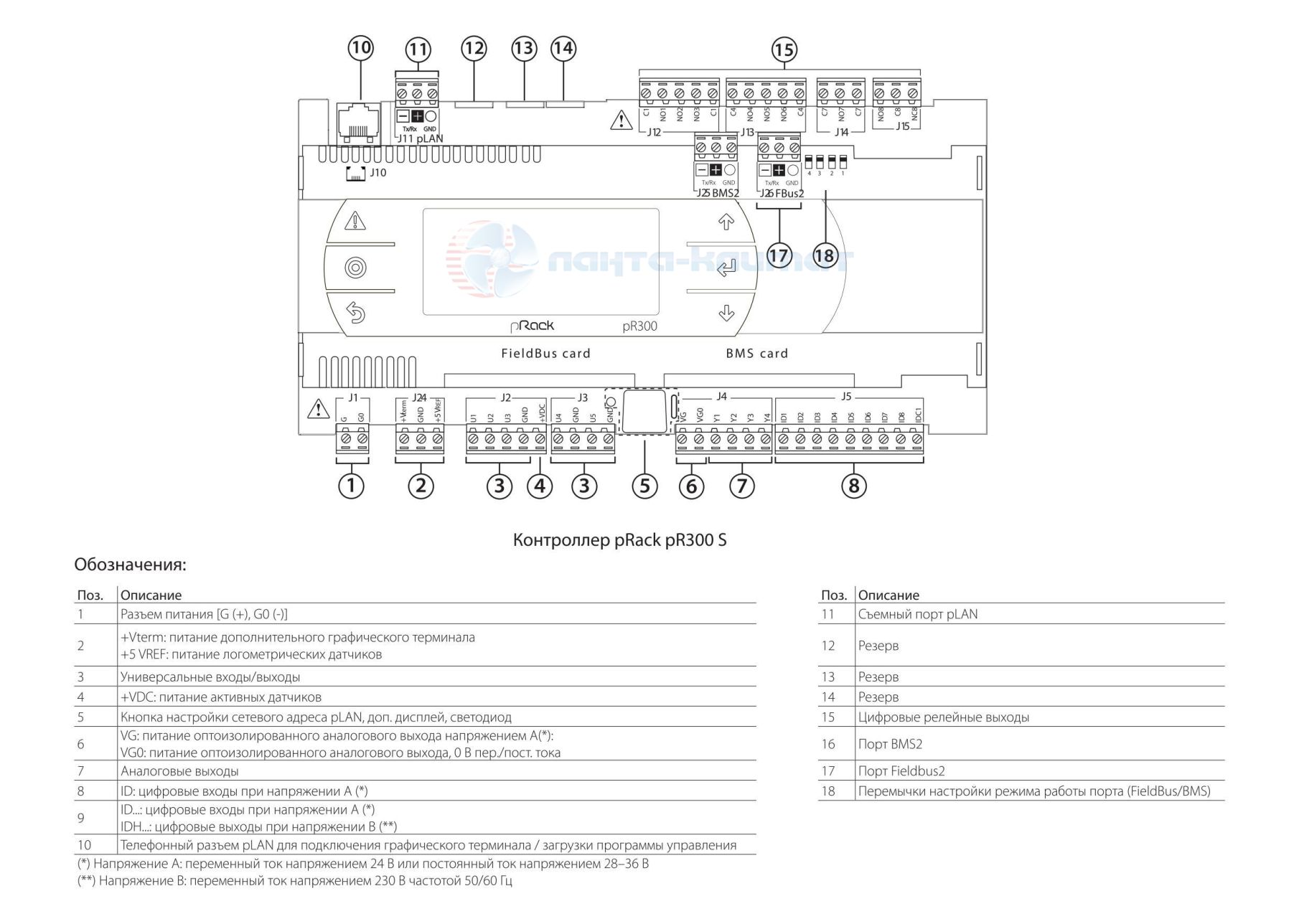 Контакты и разъёмы контроллера Carel pRack pR300, типоразмера small