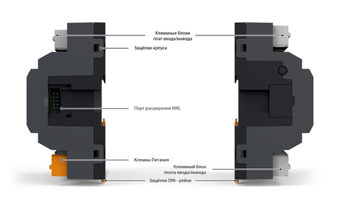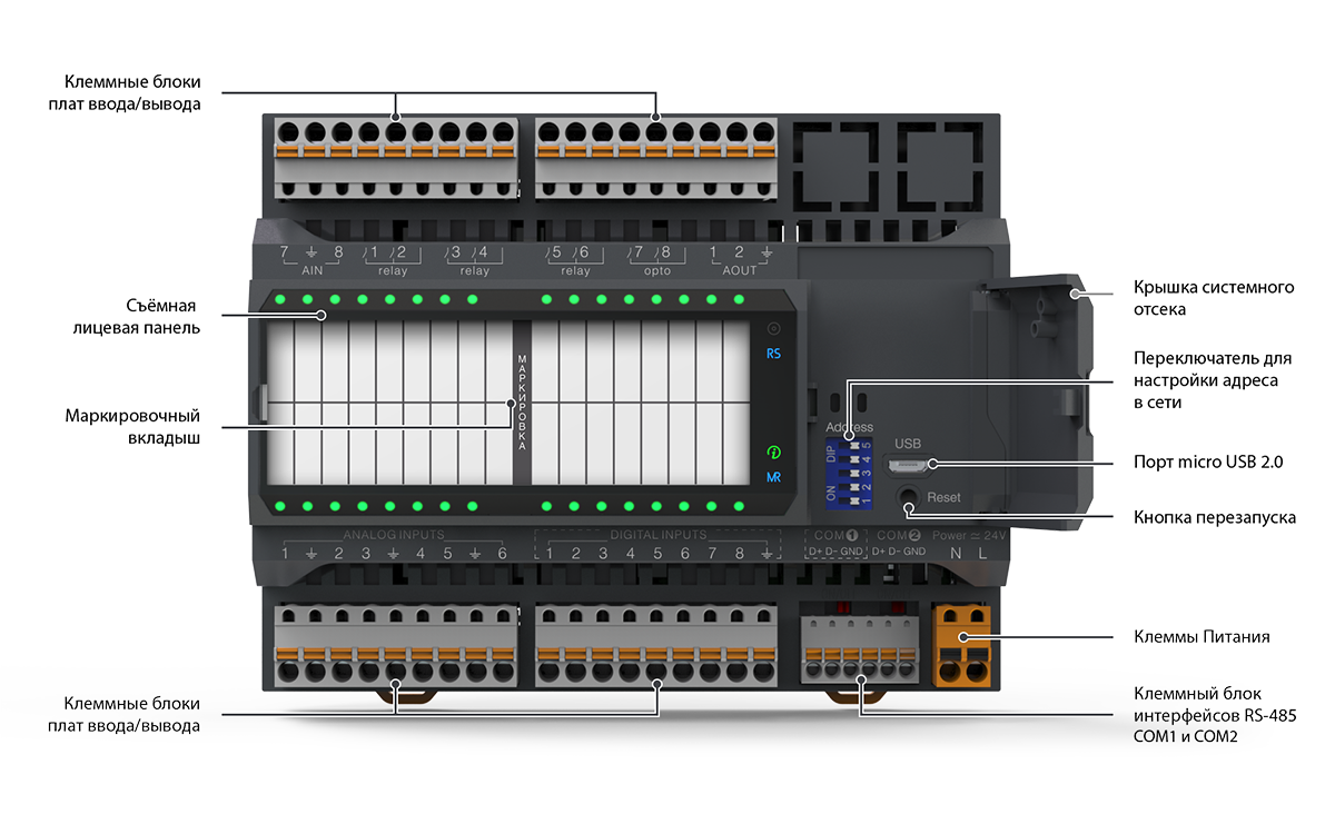| RS-485 (COM2) | Гальванически неизолированный, Разъём: клеммная колодка, Протокол: Modbus-RTU или системная шина: MR-Bus2 |