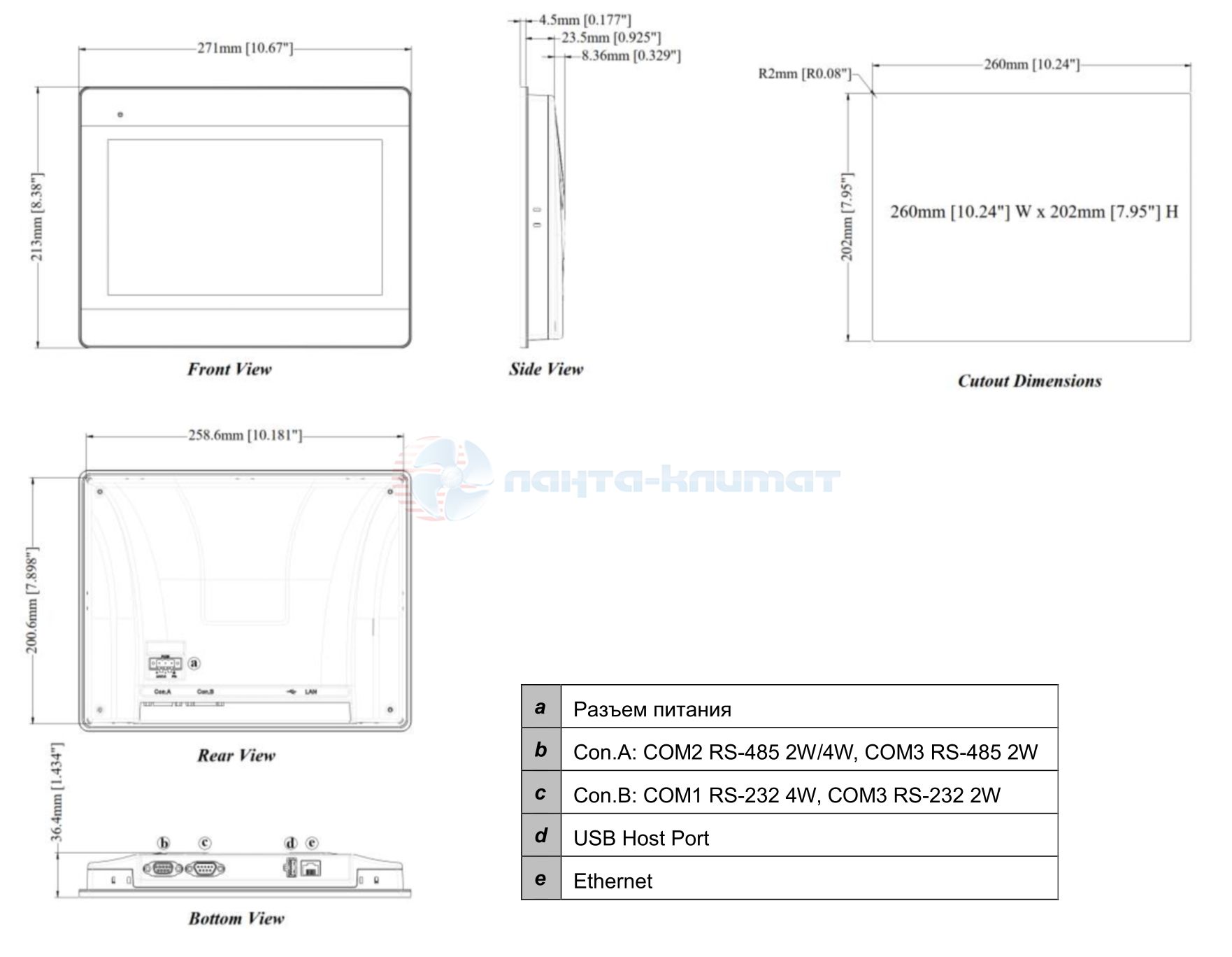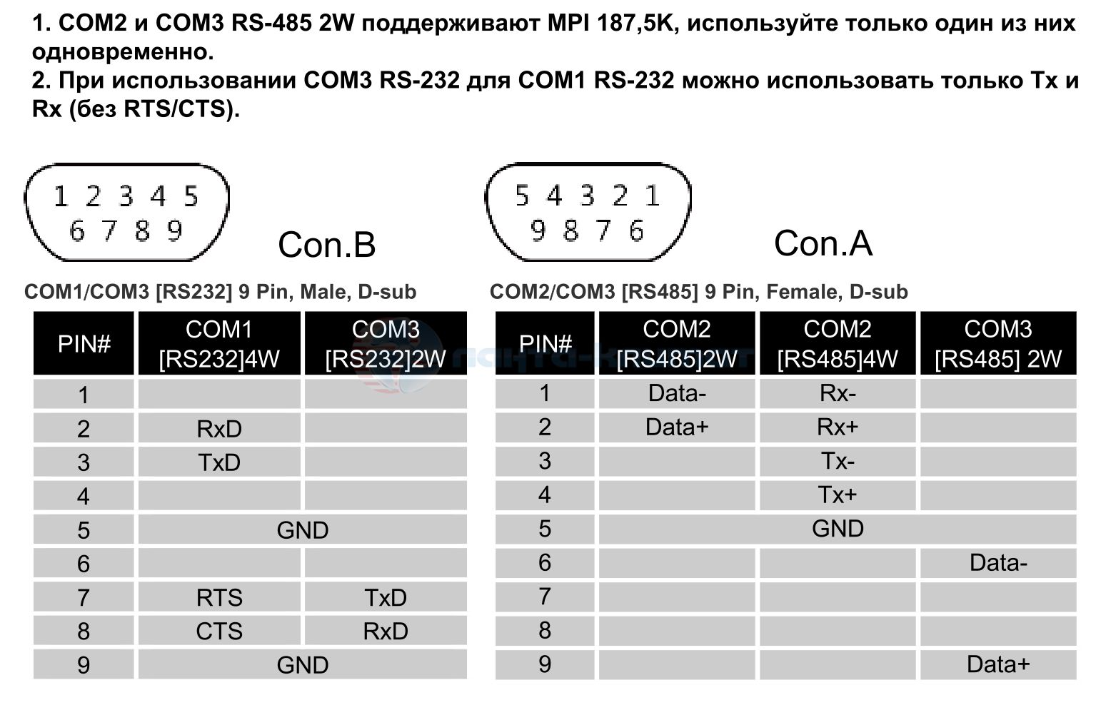 | Последовательный интерфейс | Con.A: COM2 RS-485 2W/4W, COM3 RS-485 2W Con.B: COM1 RS-232 4W, COM3 RS-232 2W |