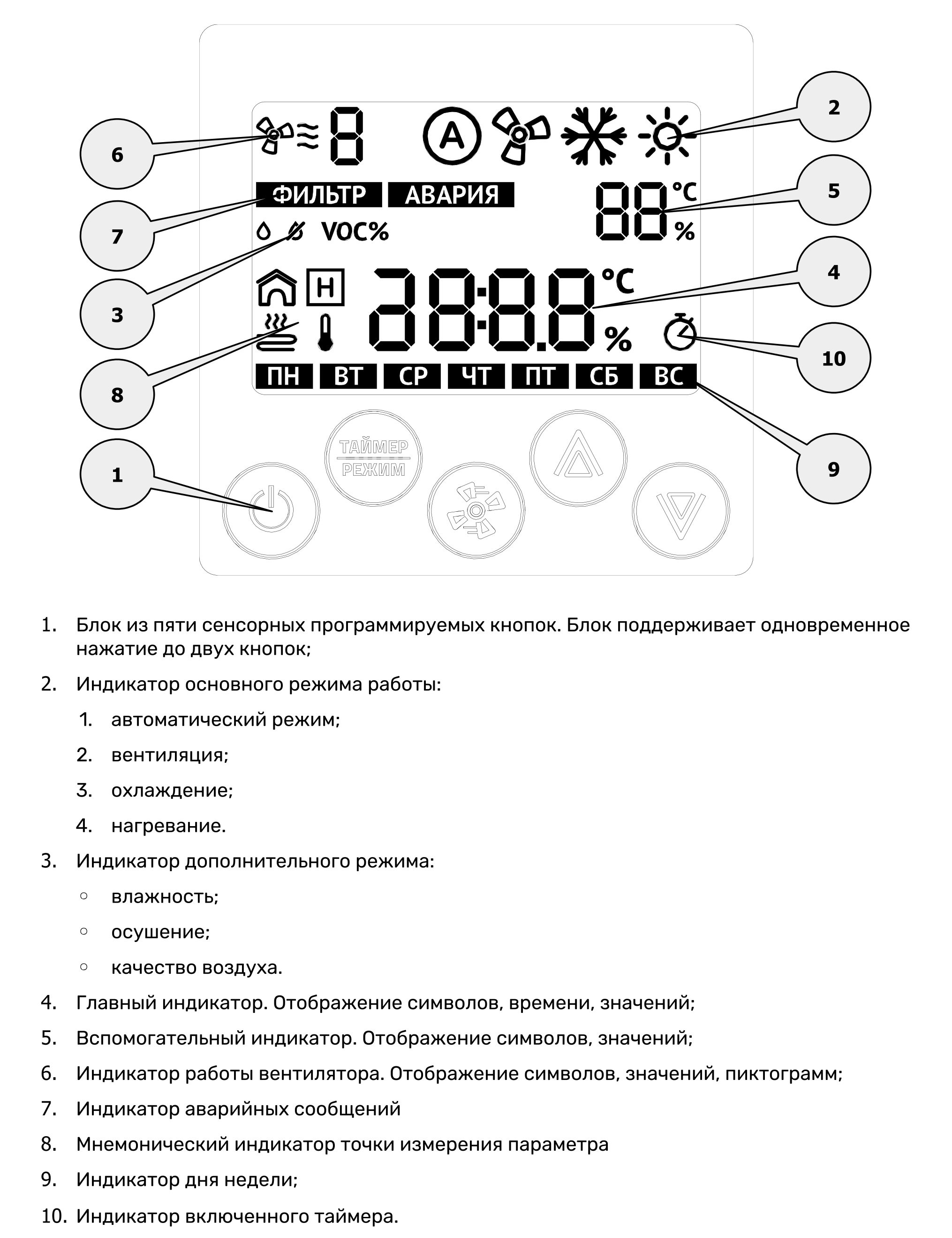 Панель управления Ballu MACHINE Z031 оснащена программируемым дисплеем. Устройство предназначено для использования в помещениях. Панель поддерживает подключение к внешним устройствам через интерфейс RS-485 с поддержкой протокола Modbus RTU. Внутри панели установлен встроенный датчик температуры, который измеряет температуру в диапазоне от -30 до +70°С.
